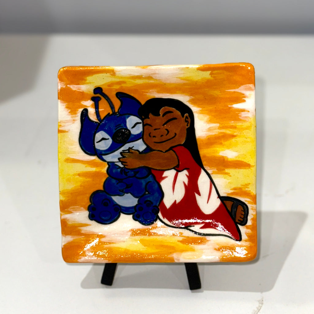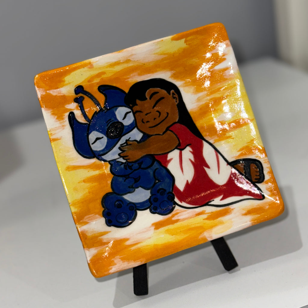 Aloha! This small hand-built square plate features a delightful hand-painted Lilo and Stitch design set against a warm sunset orange and white background. Perfect for adding a touch of Hawaiian charm to your table, this plate brings the playful spirit of Lilo & Stitch into your home. Great for serving, displaying, or gifting to fans of the beloved duo. Fired to Cone 6, microwavable, and dishwasher safe for easy use and lasting quality. Get yours and bring a little bit of paradise home! πΊπβ¨