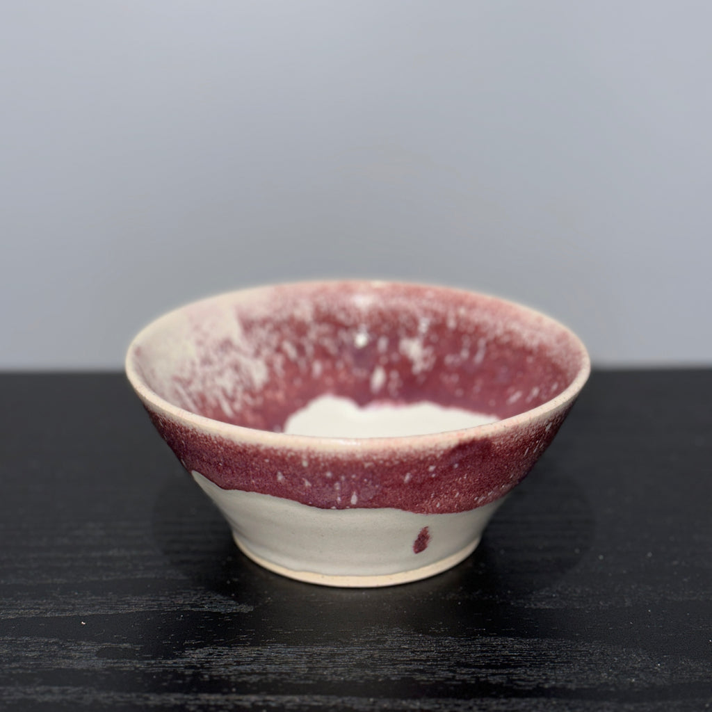 Beautiful medium sized wheel thrown Raspberry and White Speckled Drip Bowl.