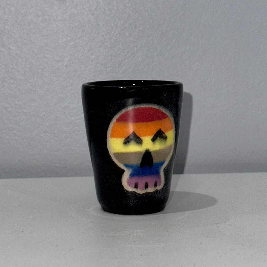 Wheel-thrown shot glass, featuring an original hand-painted Rainbow Skull design—part of our exclusive Pride series. This unique piece blends edgy artistry with vibrant colors, celebrating individuality and self-expression. Perfect for collectors, gift-givers, or anyone looking to add a standout piece to their drinkware collection. Fired to Cone 6, microwavable, and dishwasher safe for effortless use. Limited edition—grab yours before it's gone! 🌈💀✨